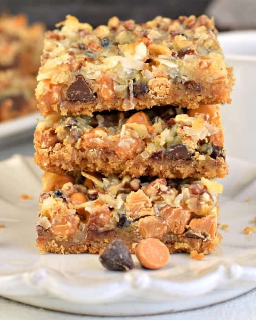 - Top crust with chocolate chips, butterscotch morsels, coconut, and pecans. Pour sweetened condensed milk over the top.